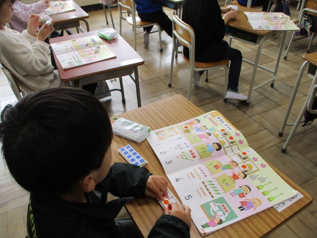 算数で、イラストにのっている絵がいくつあるのかを、数図ブロックを使って合わせてみ...