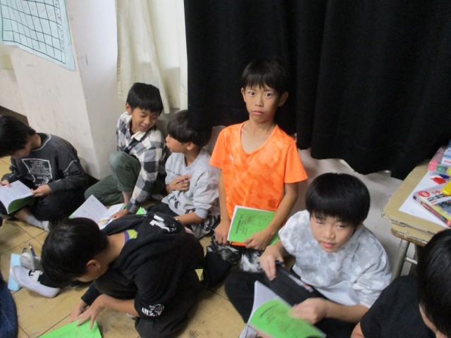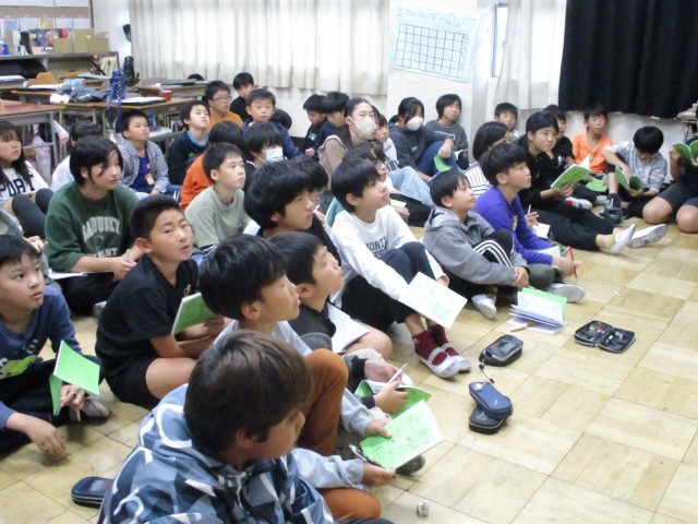 野外教育活動に向けて、学年集会をしました。しおりが配られて、めあてなどの話がありました。