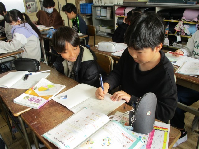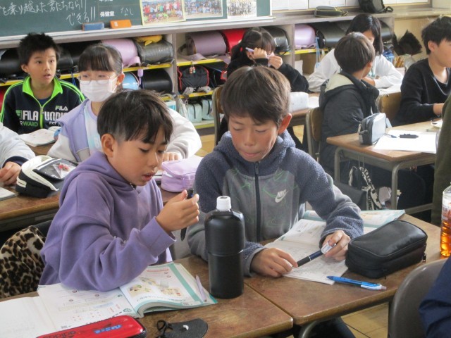 算数では、単位量あたりの大きさの学習が始まりました。こみ具合について、たたみ1枚あたり何人いるかを、みんなと話し合いながら考えました。