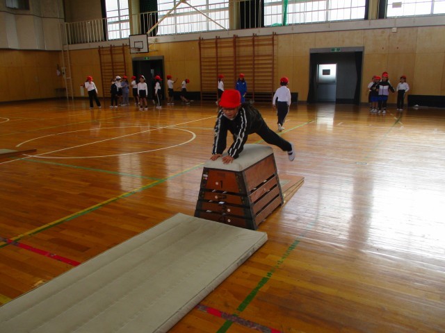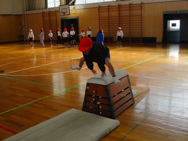 体育では、開脚跳びの練習をしています。着地にも気をつけて練習に取り組みました。