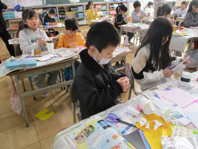 図工では、「スルスルビューン」という紙コップを使った工作をしています。