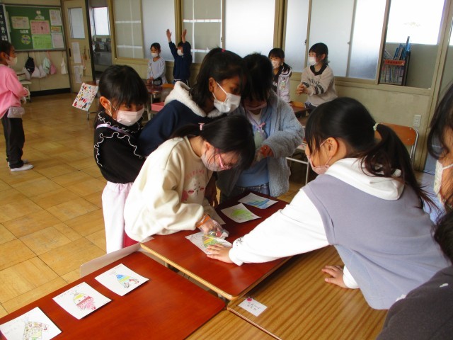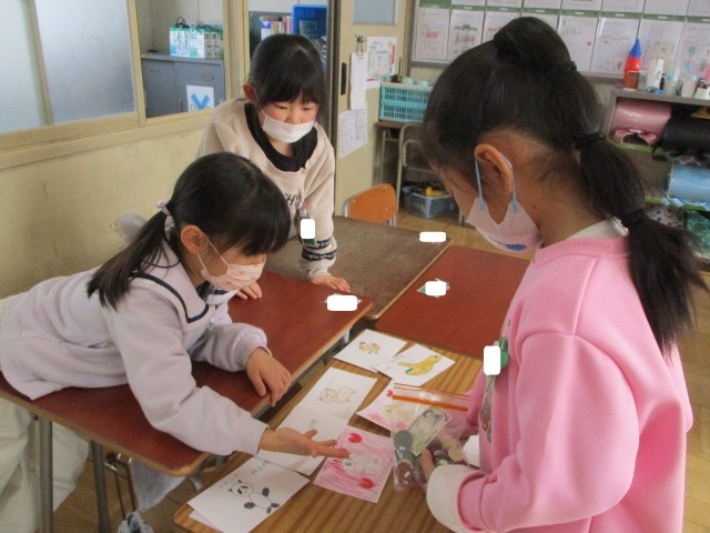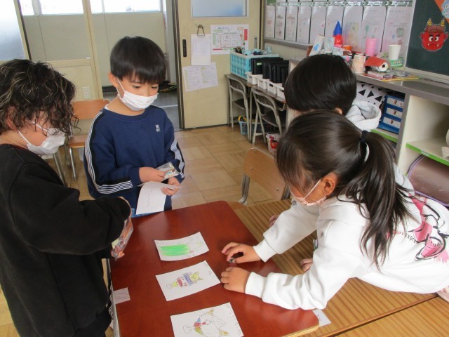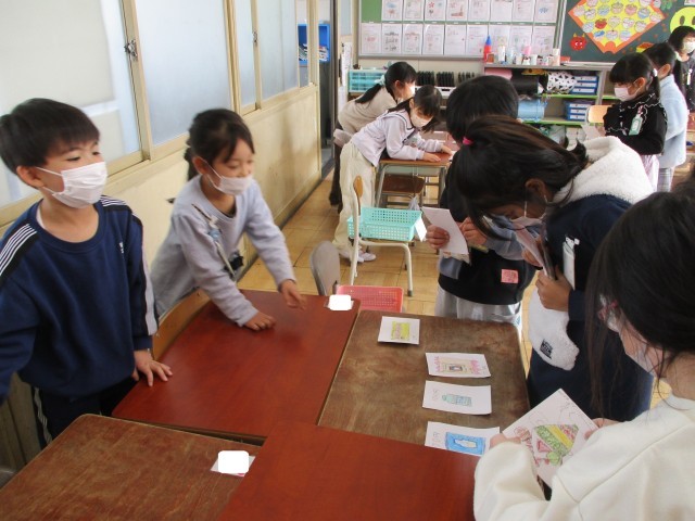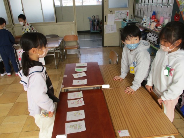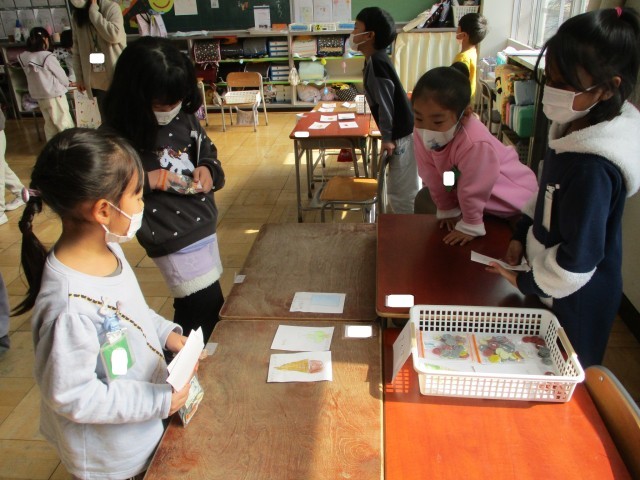 お店を決めて、何を売るか考えてカードを作りました。その後、店員さんとお客さんに分かれて、買い物を楽しみました。