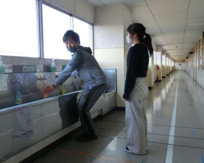 4.10 手洗い場の工夫(5年生) 公開日 2020/04/10 更新日 2020/04/10 5年生 新型コロナ対策として、手洗い場の密集の防止のためにテープを貼りました。前の人が終わるまでは線のところで待つようになっています。5年生のみんなもテープに気を付けながら手洗いができるといいですね。