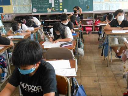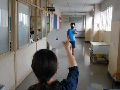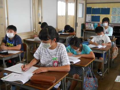 視力検査中です。 視力は悪くなっていないかな? ドキドキ・・・。 待っている子は、教室で学習です。