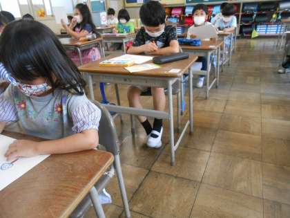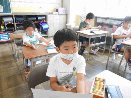 クレパスをつかって、すきなものをかきます。 くだもの、やさい、ひらがな。