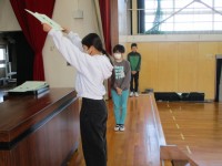 理科の授業では、体のつくりとはたらきという単元に入りました。今日は呼吸について学習しました。すう空気とはいた空気のちがいについて調べました。気体検知管を使って、酸素や二酸化炭素の量のちがいについて代表者が器具を使って調べました。