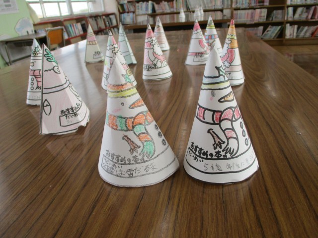 図書館も12月の雰囲気いっぱいです。ツリーの形の掲示物でおすすめの本を子どもたちに紹介しています。