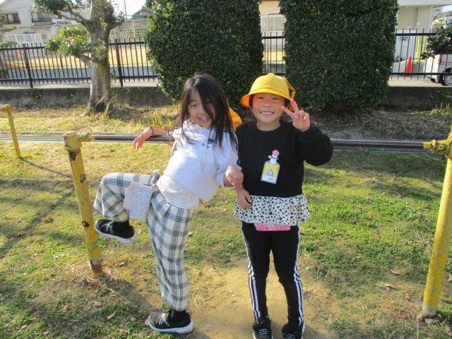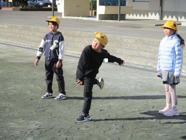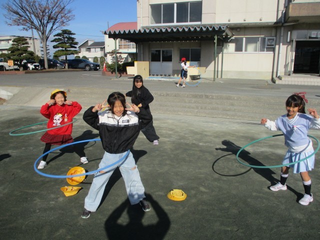 今日も風がなく暖かな日差しがさしていました。友だちとフラフープや竹馬で遊んでいる子もいました。