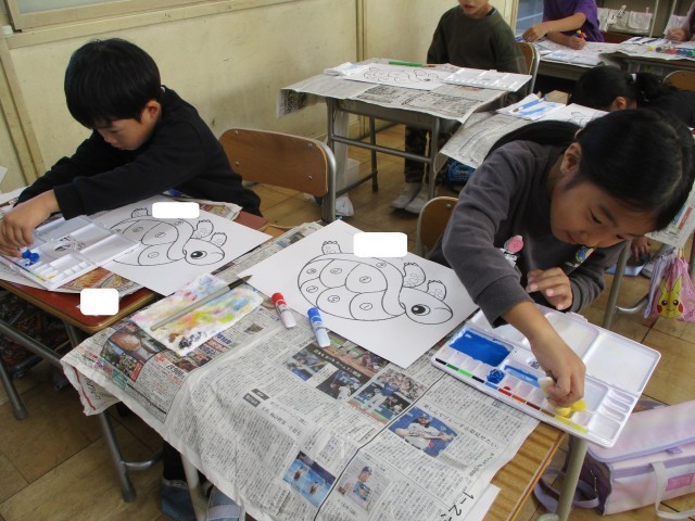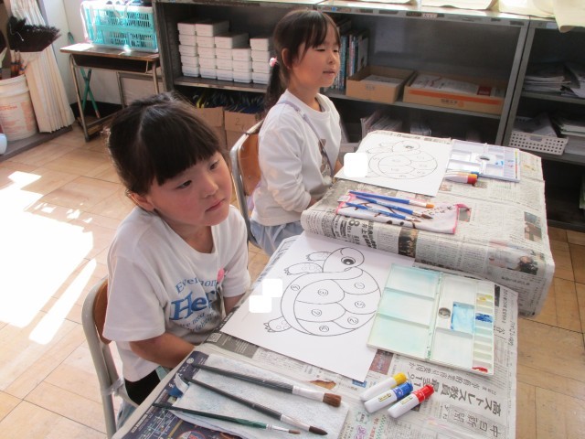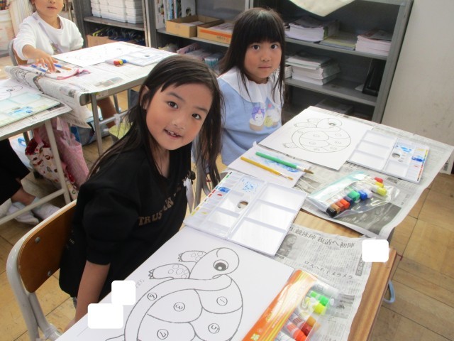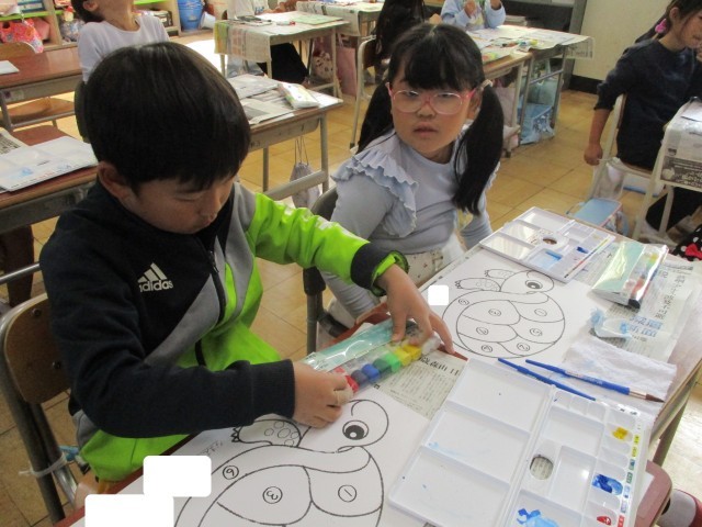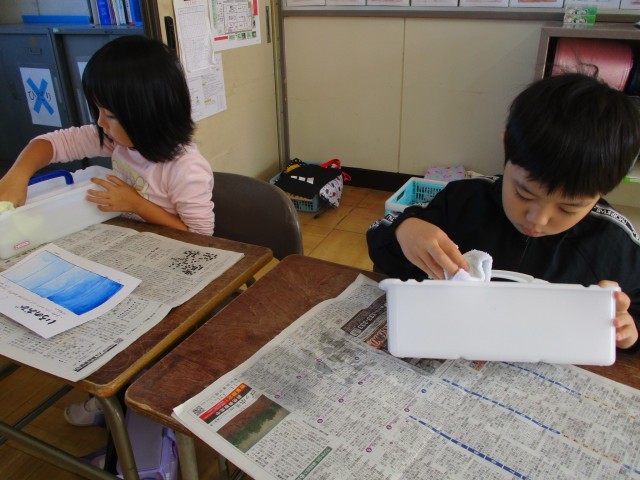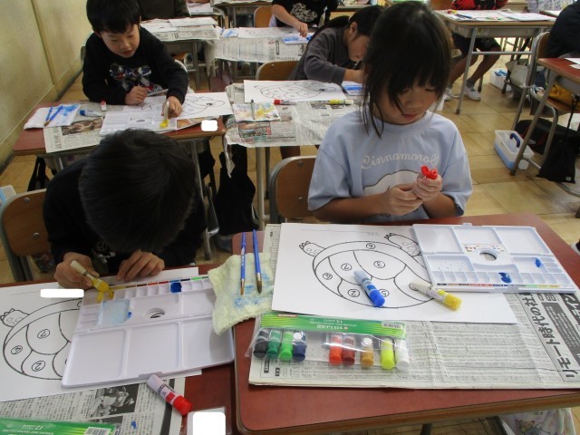 図工で絵の具を使いました。子どもたちは、「えのぐたのしかった!」と口々に言っていました。
