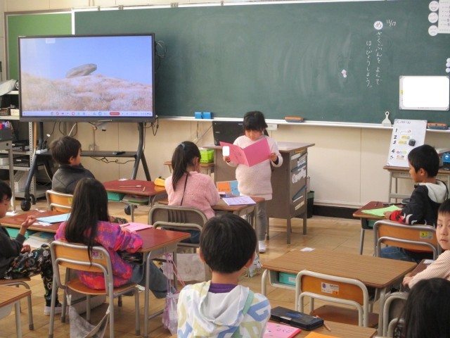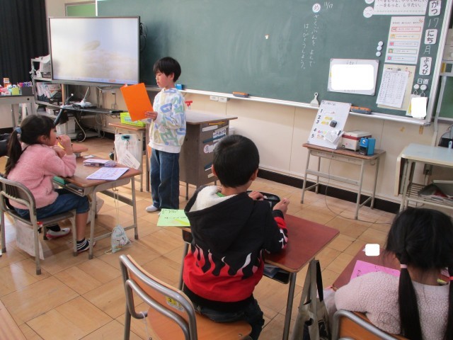 国語の「くじらぐも」の会話文を順番に読みました。内容に合わせた声の出し方を考えました。