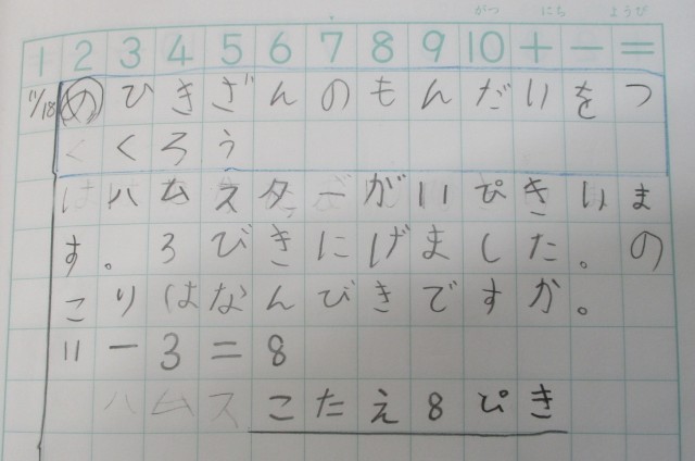 「ハムスターが11ぴきいます。3びきにげました。のこりはなんびきですか。」など、「十いくつ」-「いくつ」になる問題を上手に考えました。