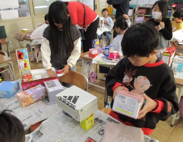 図工では、箱に装飾をして「たいせつボックス」を作成しています。