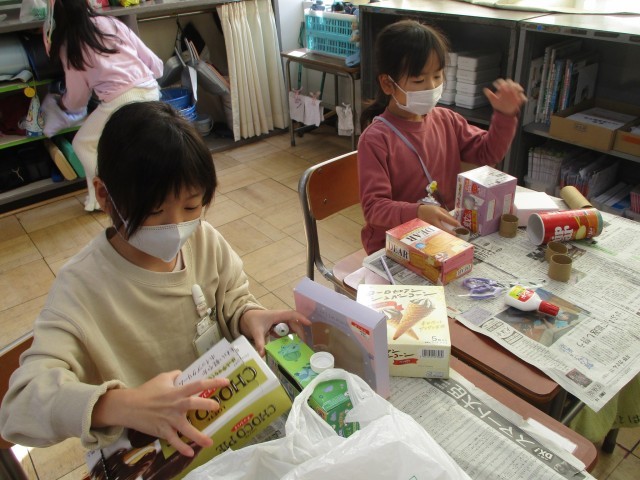 図工では、持ってきた空き箱を組み合わせて動物を作りました。