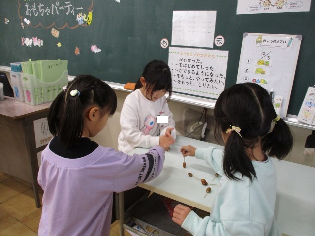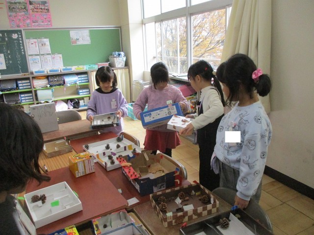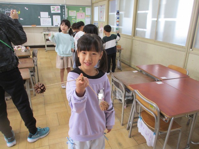 生活科で作っていた秋の植物を使ったおもちゃが完成しました。