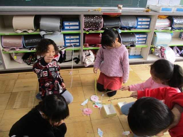 「先生、お魚つって!」「ぼく、めいろつくったよ!」「このコマよく回るよ!」と自慢のおもちゃを紹介してくれました。