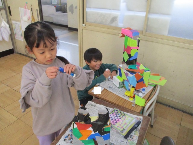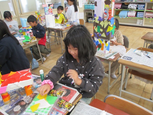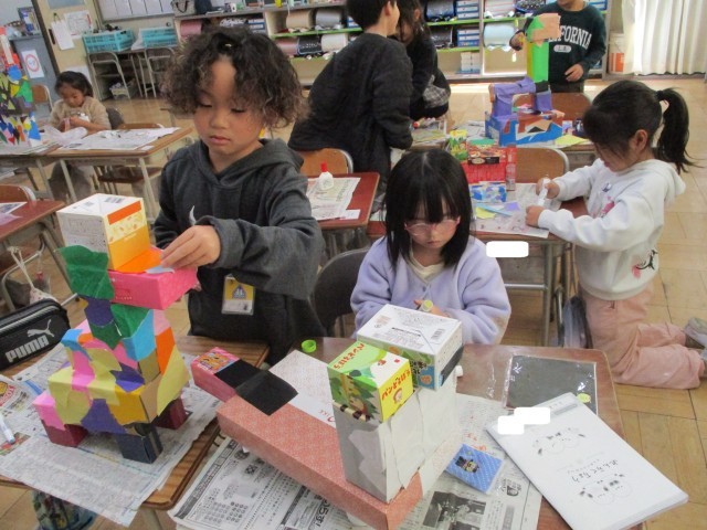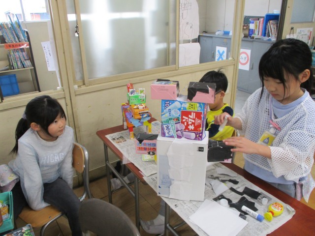 図工では、持ってきた空き箱を組み合わせて動物を作りました。