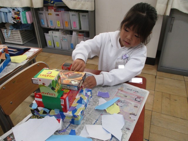 図工では、箱に装飾をして「たいせつボックス」を作成しています。