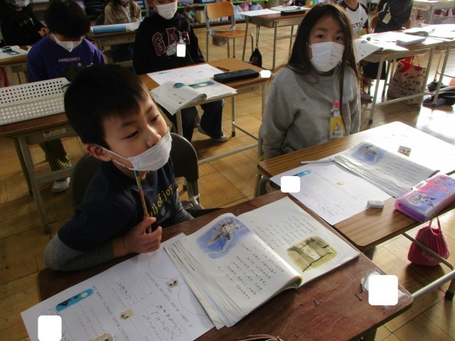 「ここおもしろいね」「ここすごいんだよ」と、友だちの作品のよさを見つけ合っていました。