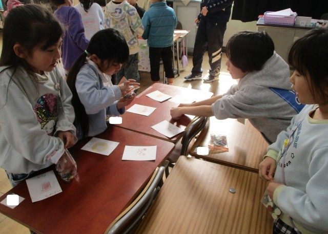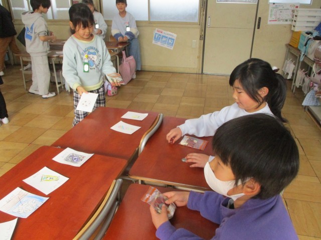 お店を決めて、何を売るか考えてカードを作りました。その後、店員さんとお客さんに分かれて、買い物を楽しみました。