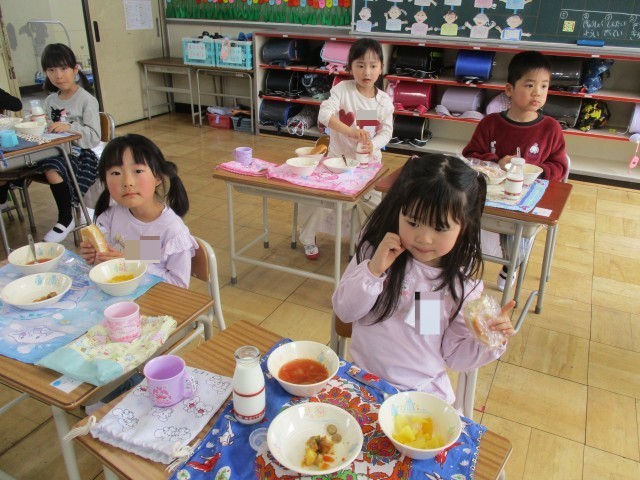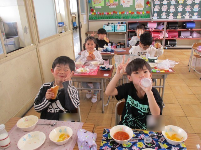 今のクラスのみんなと一緒に食べる最後の給食でした。クラスで輪になって食べたり、グループにして食べたりして、楽しい時間をすごしました。