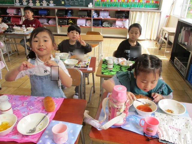 入学して初めての給食、子どもたちは朝からとても楽しみにしていました。今日のメニューは、ボローニアステーキとカブのコンソメスープ、春キャベツのサラダでした。「おいしい。」「うめ~。」と言いながら、一生懸命に食べていました。みんなすごい食欲で完食した子が半分以上!!「今日はたくさん栄養がとれたね。」と嬉しそうでした。