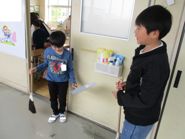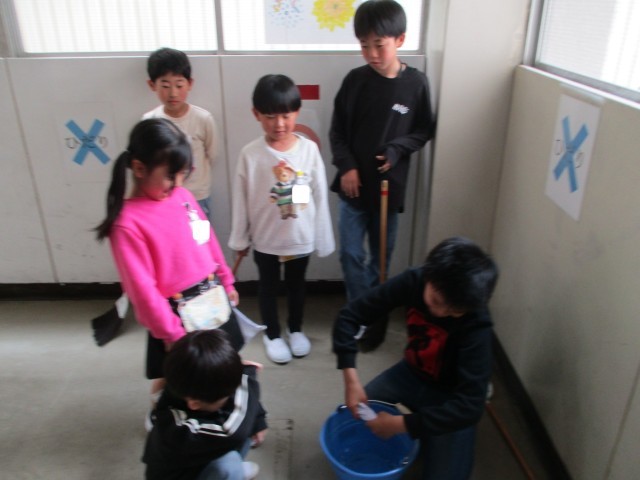 掃除は、ペアの6年生の子と一緒に行います。6年生の子に、ぞうきんのしぼり方や、ほうきの掃き方を教えてもらいました。