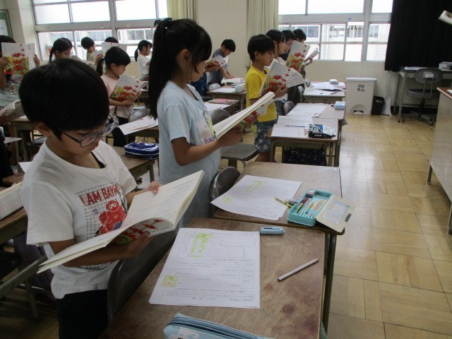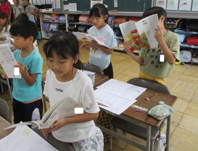 国語の時間に、グアムから交流でみえているお友達に音読を披露しました。声をそろえて心をこめて音読しました。