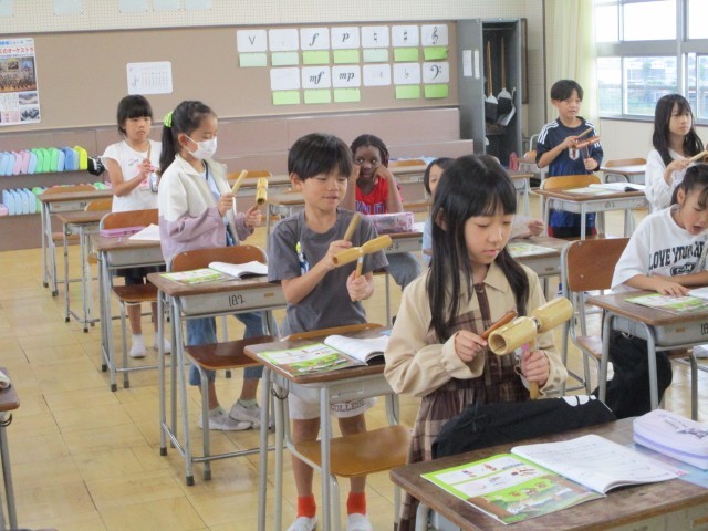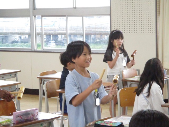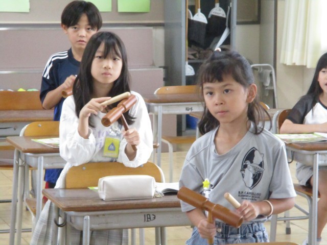 音楽の時間にウッドブロックに挑戦しました。歌に合わせて、リズムよく演奏しました。