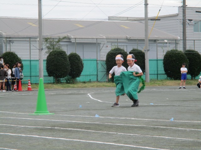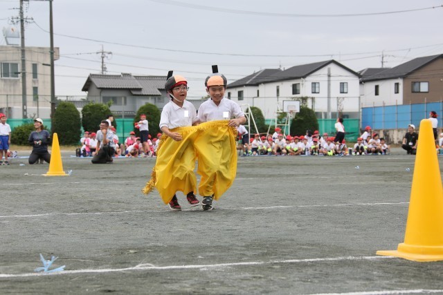 競争遊戯「大きなパンツでよーいどん!」では、二人で協力して走りました。