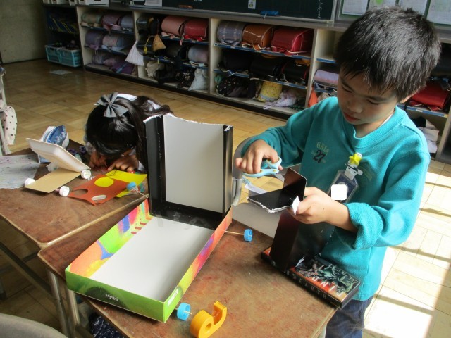 図工では、カッターナイフを初めて使いました。カッターナイフを上手に使い窓をつくった作品の一部を紹介します。