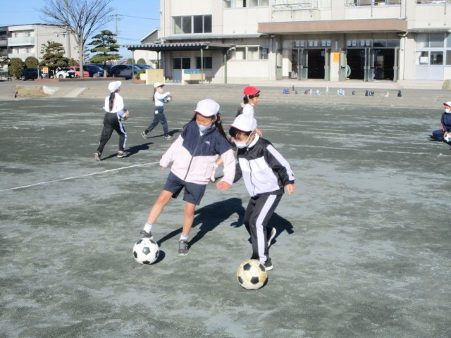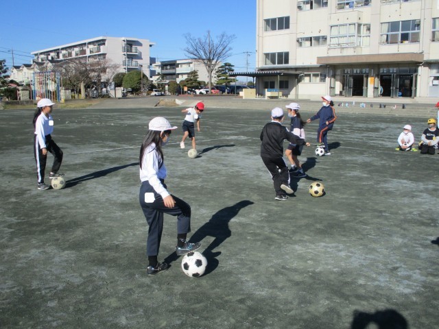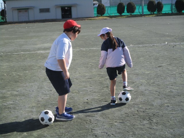 体育では、サッカーをしました。自分のボールをキープしながら、相手のボールをコートからけり出すゲームを楽しみました。