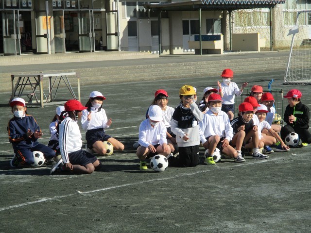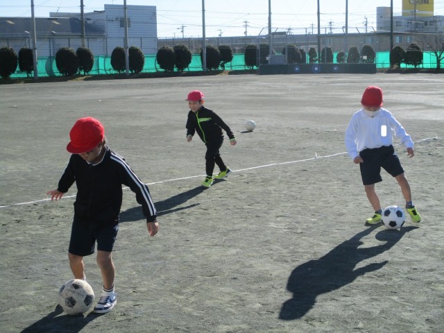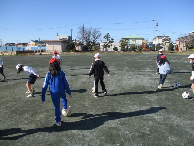 自分のボールを守りながら、友だちのボールをコート外に蹴り出すゲームをしました。蹴り出されると自分のボールだけでなく、周りも見なくてはいけません。がんばって顔を上げるのを意識しながらプレーしました。