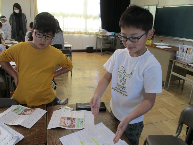国語「みきのたからもの」から読みとった人物の様子を動作で表しました。書かれている言葉を深く読むことができました。
