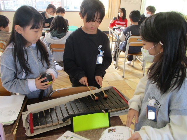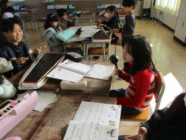 音楽では、「チャチャ マンボ」の合奏に取り組んでいます。鍵盤ハーモニカや木琴、マラカスなどに分かれて息をそろえて練習しました。