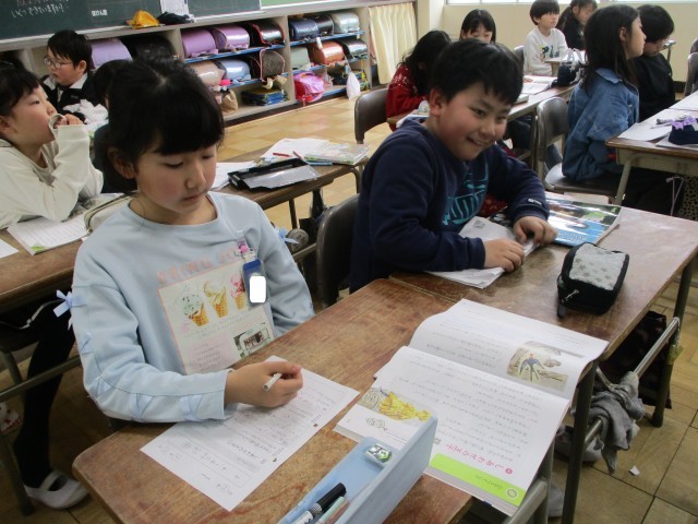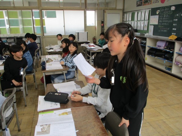 国語「みきのたからもの」から読みとった人物の様子を動作で表しました。書かれている言葉を深く読むことができました。