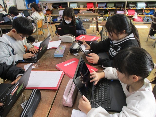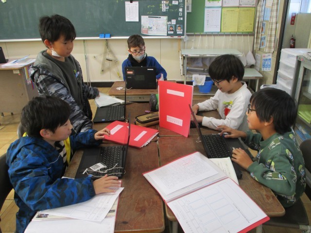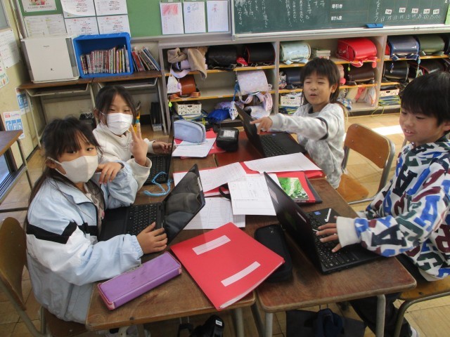 3学期の「わくわくフェスタ」の発表に向けて、班で学習者用端末を使ってスライドづくりを始めました。