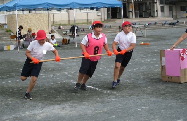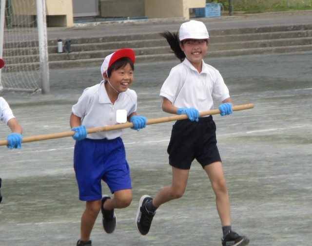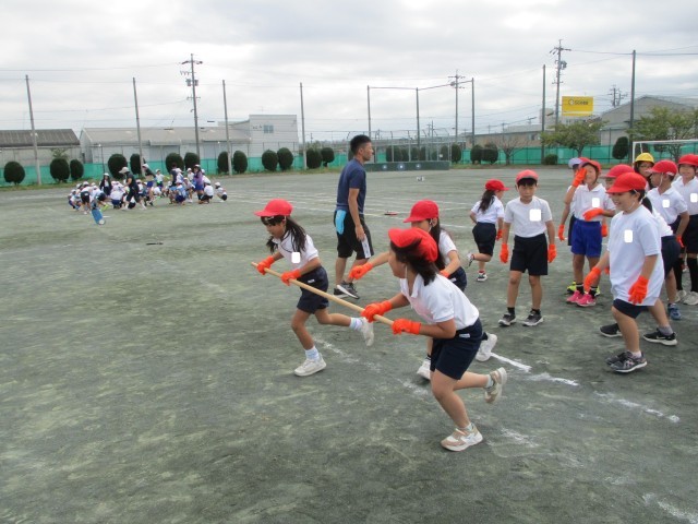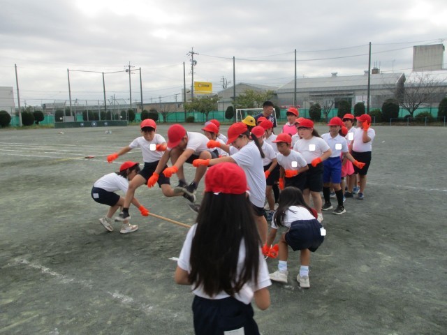 競争遊戯の「丹陽万博2025 吹かせよう 笑顔の風」の練習をしました。3人で棒をもち、息をそろえて走ります。