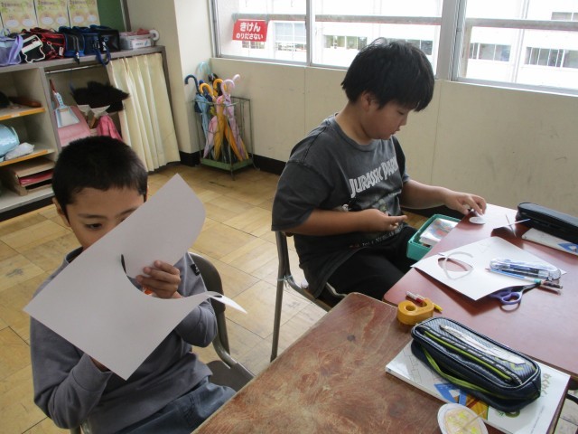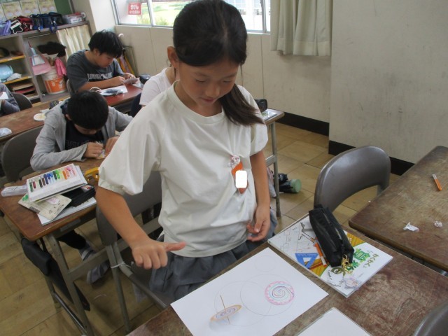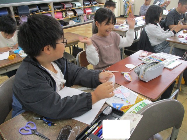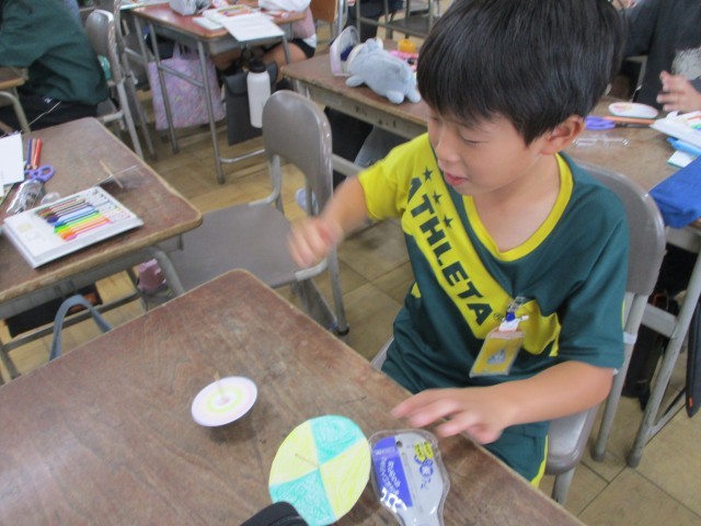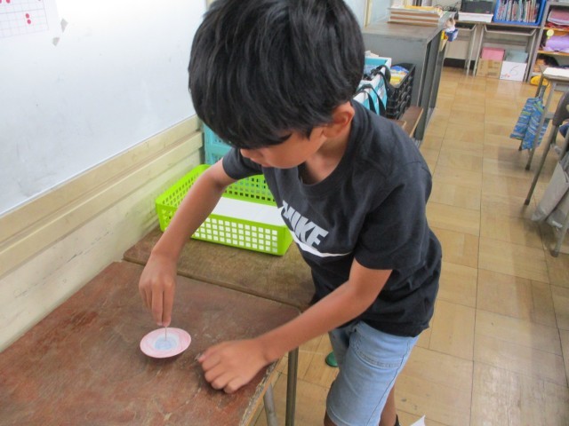 今日は、学習の導入として、コマを作りました。コマは、回すとどんな形でも円になることを実感しました。
