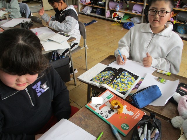 国語では、「モチモチの木」という物語文で学習をしています。一文交代読みで、みんなで順番に音読しました。