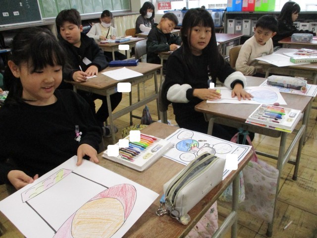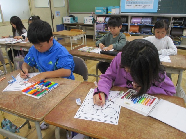 2日目の今日は、教室に飾る気球の色塗りや自己紹介カードを作成しました。みんなとても上手に仕上げています。