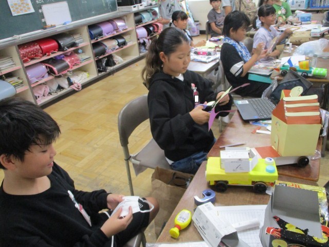 「僕の車は、サンルーフがあるよ」「わたしは猫の顔があるよ」「魚がたくさんいるんだ」と図工で作っている想いのこもった作品を、笑顔で紹介してくれました。