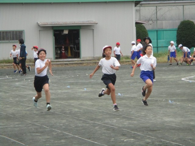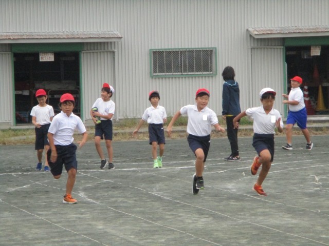 体育では、リレーに取り組んでいます。仲間がつないだバトンを受け取り全力で走りました。