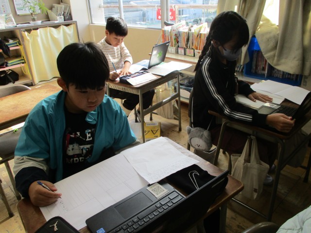 国語では、読み取った説明文の要約に挑戦しました。指定された字数で収めるためにどのようにまとめていくといいか一生懸命考えました。