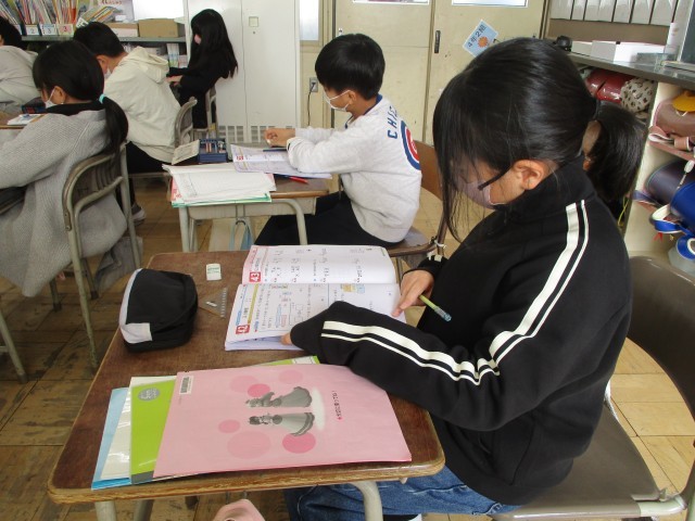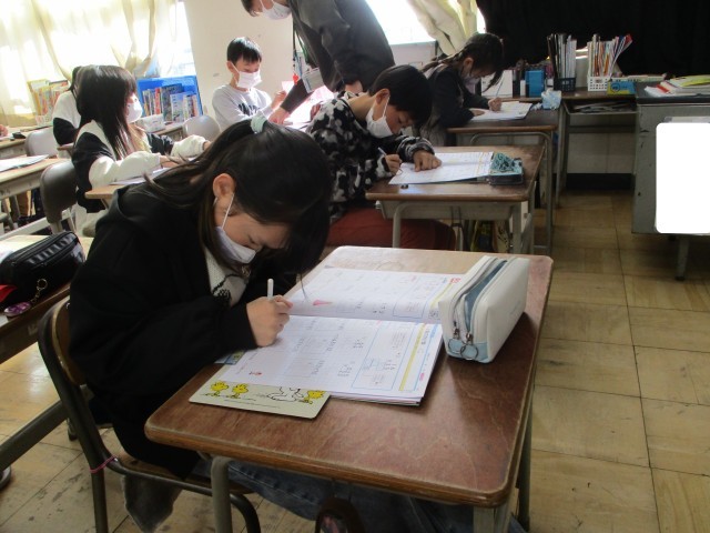 国語では、読み取った説明文の要約に挑戦しました。指定された字数で収めるためにどのようにまとめていくといいか一生懸命考えました。