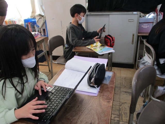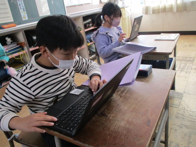 「わくわくフェスタ」の発表に向けて、学習者用端末を使ってスライドを作っています。