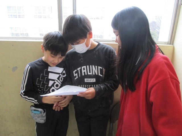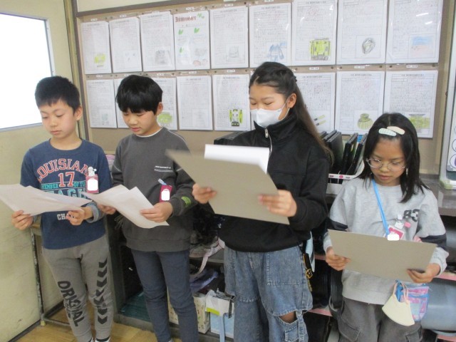 明日の児童鑑賞会に向けて、学年で発表を見合いっこしました。