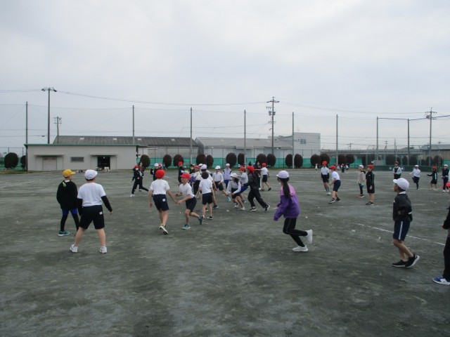 体育では、3分間走を行いました。運動場にかかれた特設コースを、それぞれのペースで走り切りました。その後、学年の子みんなでドッジボールをしました。