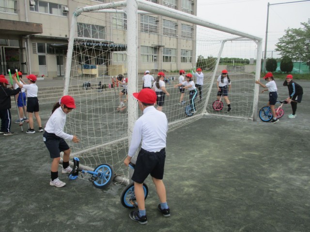 体育では、サッカーの試合をしました。5・6人のチームのみんなと力を合わせて勝利を目指しました。