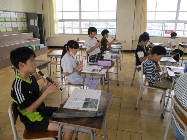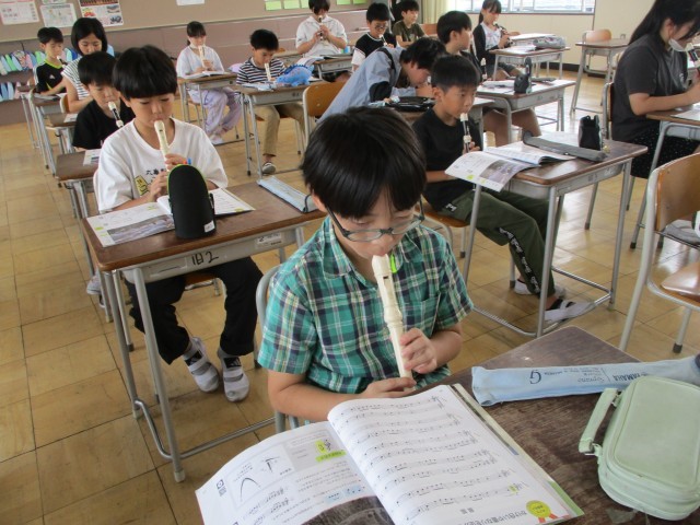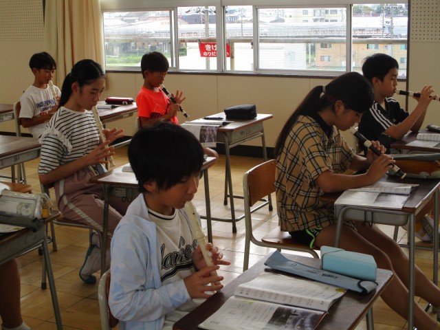 音楽のリコーダーの学習では、「星笛」という曲を練習しています。音の重なりを意識して演奏しています。