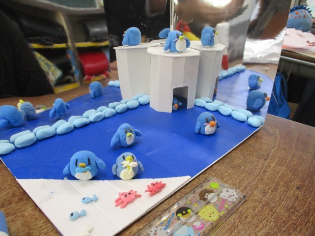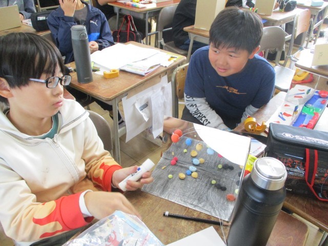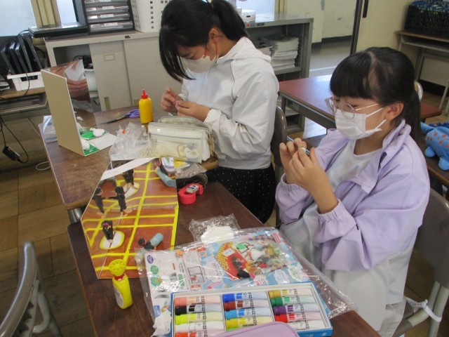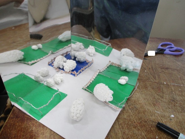 図工の時間で作成していた「ミラクルミラーワールド」がほぼ完成しました。鏡面を工夫しながら、自分が表したい場面を紙粘土で表しました。